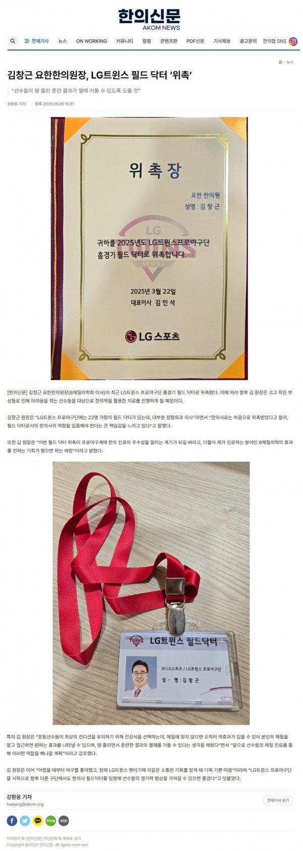 [한의신문] 김창근 요한한의원장, LG트윈스 필드 닥터 '위촉' 페이지 정보 작성자 요한한의원 댓글 0건 조회 617회 작성일 2025-05-21 13:31 본문 김창근 요한한의원장, LG트윈스 필드 닥터 ‘위촉’ > 뉴스 | 한의신문 목록 다음글[한의신문] 8체질의학과 유전자간 연계성 분석 '눈길' 22.09.30 댓글목록 댓글목록 등록된 댓글이 없습니다.