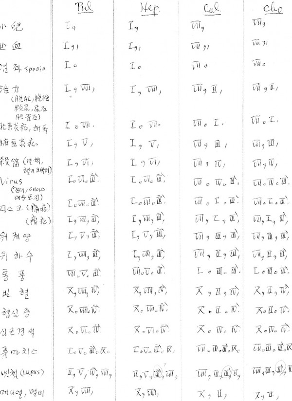 처방이 기호로 써 있어서 일반인들은 알아보기 어렵겠지만 이미 언급했듯이 동일한 질환이라도 체질이 다르면 그 병리가 달라서 접근 방법이 다르므로 침처방이 체질마다 다르게 표기되어 있는 것을 알 수 있다.